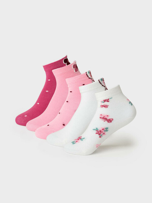 Набор из пяти пар детских носков для девочки. У каждой пары — свой рисунок: бабочка, цветы, узоры. На подошве расположены прозрачные силиконовые стопперы, которые предотвращают скольжение. Размерная маркировка также выполнена жаккардом на стопе. Материал — мягкий хлопковый трикотаж.