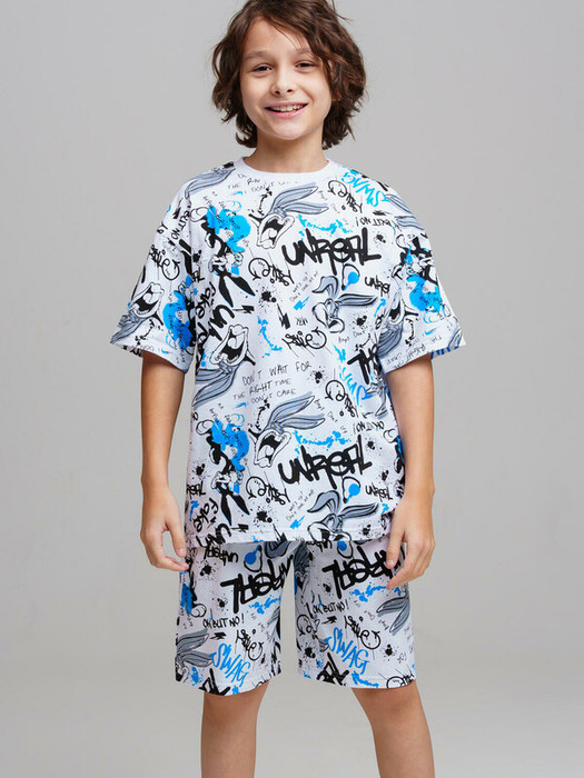 Пижама для мальчика подростка. Футболка и шорты из эластичного и приятного на ощупь трикотажа. Шорты на резинке со шнурком. Высокое содержание хлопка 95%. Благодаря наличию эластана в составе ткани изделие держит форму и меньше мнется.