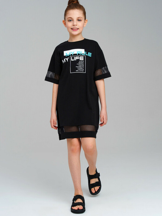 Платье для девочки подростка. Оверсайз платье-футболка из качественного и приятного на ощупь трикотажа джерси. Высокое содержание хлопка 95%. Благодаря наличию эластана в составе ткани изделие проще в уходе и держит форму. Декор из сетки. Модель выполнена из качественного и приятного на ощупь трикотажа.