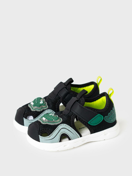 Детские сандалии для мальчика. Сандалии с закрытой пяточной и носочной частью. Сандалии выполнены из дышащего текстиля и дополнительно усилены искусственной кожей в носочной части. Удобная липучка позволяет регулировать обувь на любой подъем и обуваться ребенку самостоятельно. В обуви стоит текстильная 100% хлопковая подкладка, которая обладает высокой гигроскопичностью. Стелька выполнена из свиной натуральной кожи. Модель декорирована патчем в виде веселого крокодильчика с LED подсветкой. Подошва из ЭВА очень легкая и гибкая.
