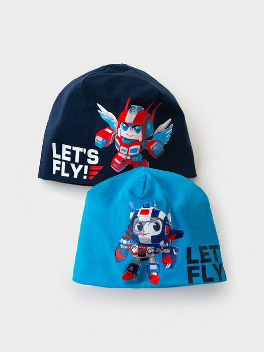 Набор детских трикотажных шапок для мальчика. Материал с высоким содержанием хлопка. 2 шапки в комплекте. Спереди размещен крупный рисунок.