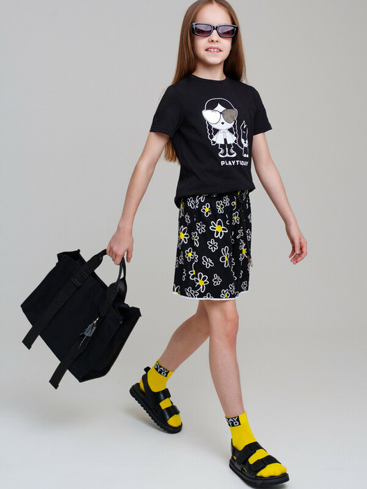 Шорты для девочки подростка. Лёгкие и удобные шорты из 100% вискозы подойдут для активных летних дней. Модель украшена ярким принтом с ромашками на контрастном тёмном фоне, создавая игривое и жизнерадостное настроение. Эластичный пояс с регулируемым шнурком обеспечивает комфортную посадку. Отличный выбор для прогулок, отдыха и повседневной носки.