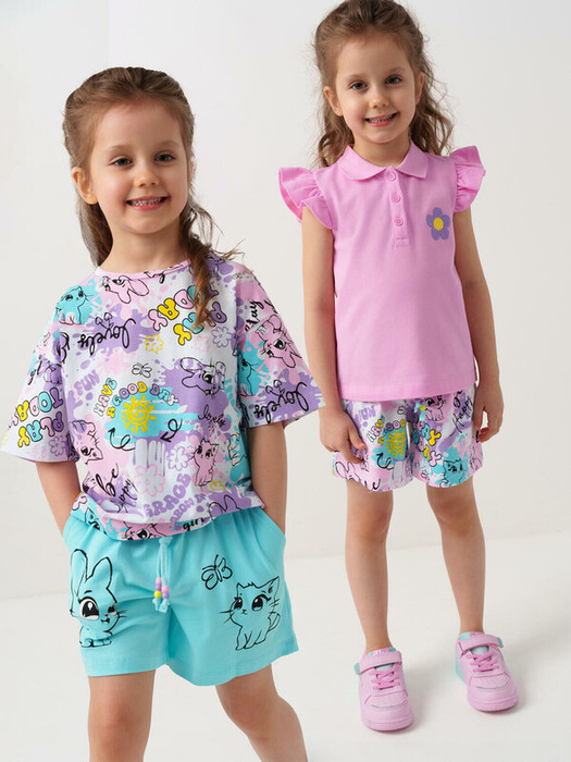 Набор детских шорт для девочки. В комплект входят две пары шорт свободного кроя. Модели из мягкого, хлопкового трикотажа джерси. Удобная посадка обеспечивается эластичным поясом со шнуром с бусинами. По бокам расположены два кармана.
