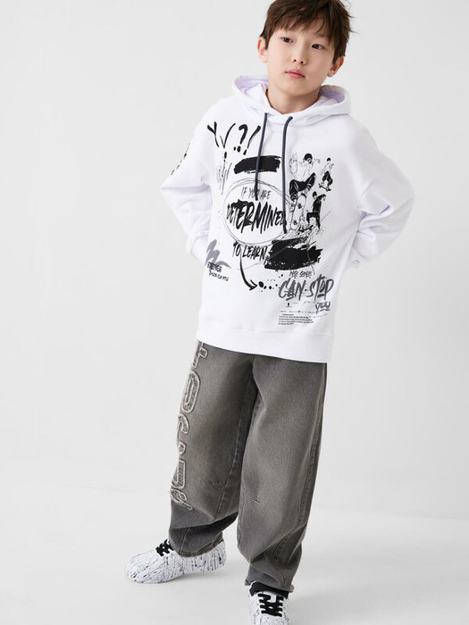 Худи оверсайз для мальчика подростка. Модель выполнена из мягкого, хлопкового футера без начеса. Длинные рукава на манжетах и широкий эластичный пояс по низу. Капюшон с подкладкой и шнурком для регулировки. На передней части размещён яркий принт с графикой и текстами в стиле уличного искусства. На спине — дизайнерский принт.