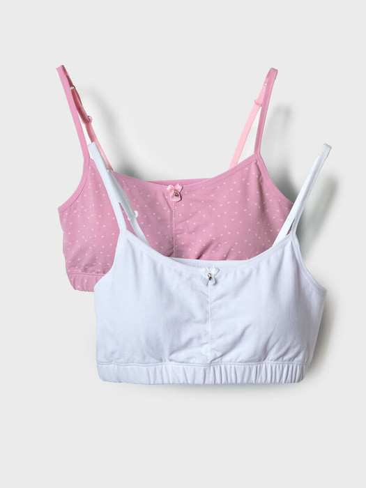 Набор из двух мягких топов-бра для девочки подростка. Один вариант однотонный белый, второй — розовый в горошек. Модель на тонких бретелях с регулируемой длиной и эластичной широкой резинкой внизу для комфортной посадки. Спереди — аккуратный бантик. Ткань мягкая и эластичная, приятная к телу.