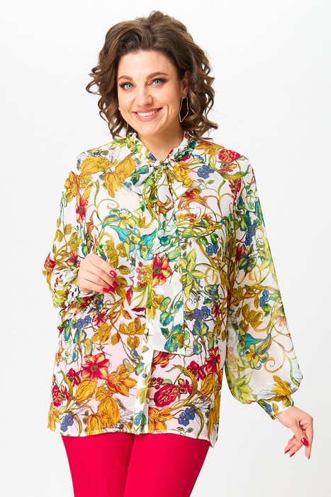 Прозрачность - тренд 2025 года. Блузка с синими и красными цветами, с объемными рукавами покроя реглан на манжетах прекрасно впишется в любой гардероб. Шифоновая блузка с планкой на пуговицах, с V-образной горловиной и воротником-стойкой с удлинёнными концами, которые завязываются на бант, прекрасно сидит на фигуре, прямой крой вещи вытягивает силуэт, скрывает несовершенства и подчёркивает достоинства. Полупрозрачная прямая модель подойдет на лето для носки в теплую погоду, зимой под жакет, жилет, кардиган, прекрасно сочетается как с классическими брюками и юбками, так и с джинсами.