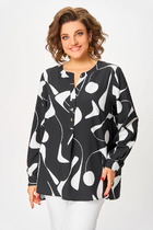 Блуза женская, прямого силуэта из текстильной ткани. Воротник отложной, застежка центральная на петли-пуговицы. По переду нагрудные вытачки и настрочены накладные карманы. Спинка цельная. Рукав втачной, одношовный, 3/4, с притачной манжетой. В боковых швах по низу небольшие разрезы. Длина по спинке 74 см, длина рукава 45.