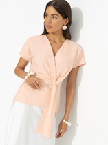 Свободная блуза с ассиметричным кроем передних деталей и воротника. Застёжка на пуговицы скрыта отворотом декоративной детали. На спинке кокетка. Рукава с манжетами на пуговицах.
