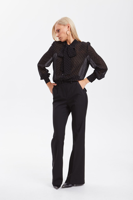 Брюки из костюмной ткани с посадкой на талии, длиной до щиколотки, прямые от середины бедра до колена и слегка расширены от колена к низу. Передние половинки с карманами, наклонными к боковым швам с отделочной планкой по линии входа в карман, с застёжкой на молнию в среднем шве. Детали спинки с двумя парами талиевых вытачек, и настрочными клапанами со скруглёнными концами и отделкой по краю. По боковым швам притачные лампасы из отделочной ткани. Пояс-обтачка с застёжкой на петлю и пуговицу, с пятью шлёвками для съёмного пояса. По передним и задним половинкам заутюжены стрелки.