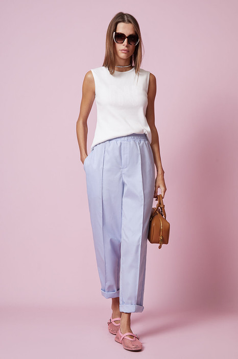 Летние укороченные брюки из фактурного хлопка , немного зауженные книзу. Брюки без застежки. Карманы в боковых швах. По талии декоративная резинка . По переду застрочены декоративные канты.