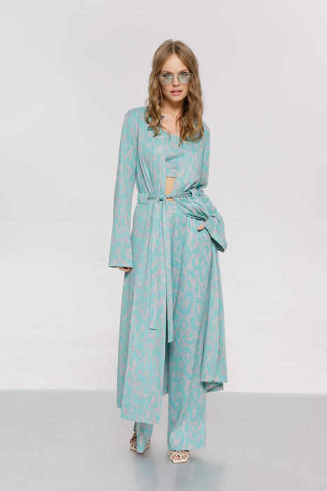 Кардиган с высокими разрезами из мягкого трикотажа с анималистичным принтом. Детали: прямой силуэт, спущенная линия плеча, рельефы переда и спинки, втачные длинные рукава с разрезами по низу, кулиса, съемный пояс, кардиган без застежки