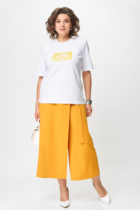 Модный и актуальный женский комплект из двух предметов. Брюки-кюлоты с элегантным запахом, свободной посадки, брючины широкие укороченные, чуть выше щиколотки. По переду молния, сзади по поясу вставлена резинка, запах фиксируется поясом на пряжки. Футболка из мягкого и приятного к телу трикотажа. Футболка свободного кроя, рукав укороченный, по переду в качестве декора — яркий принт. Оба изделия прекрасно сочетаются между собой и могут смело создавать дополнительные стильные комбинации с другими вещами. В данном комплекте будет комфортно в жаркие летние дни. Длина футболки по спинке 62 +/-1 см, длина рукава 30 +/-1 см. Длина брюк по боковому шву 94 см, шаговому — 60 см. Изделие подойдет на рост 170 см.