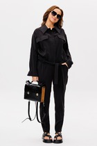 Костюм двухпредметный: состоит из рубашки и юбки. Рубашка прямого кроя со спущенной линией плеча. Горловина обработана рубашечным воротником с отрезной стойкой. Застёжка центральная на кнопки. Есть нагрудные карманы и в боковых швах. Низ рукава обработан притачной манжетой, застёгивается на кнопки. Фигурный низ. Изделие без подкладки. Элегантная юбка прямого силуэта длиной миди с разрезами на переднем и заднем полотнищах. Переднее полотнище с частичным запахом, имитацией боковых карманов с отрезным бочком. Заднее полотнище со средним швом, отрезной кокеткой, накладными карманами. Пояс притачной.