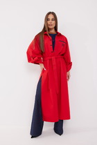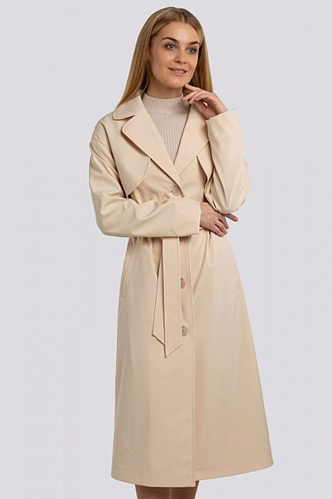 Женственный однобортный плащ из ткани бондинг. Ткань бондинг состоит из двух слоев: верхний слой костюмная ткань, нижний слой-тонкое трикотажное полотно. Такое сочетание придает ему нужную плотность, хорошо пропускает воздух. Плащ свободного покроя, спущенное плечо, свободный рукав. Застежка изделия на пуговицах. Талию подчеркивает съемный пояс. Большой английский воротник. Карманы листочка. На переде и спинке отлетная кокетка.