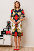 Платье женское прямого силуэта покроя реглан. Лиф переда с нагрудными вытачками, с планками и застежкой на петли и пуговицы. В боковых швах обработаны карманы. Спинка цельная. Рукав двухшовный с эластичной тесьмой по низу. Низ платья состоит из трех воланов, изделие без подкладки.