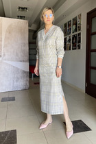 Платье полуприлегающего силуэта, верх жакетного типа с запахом. Юбка расширенная со сборкой по талии, на подкладке.