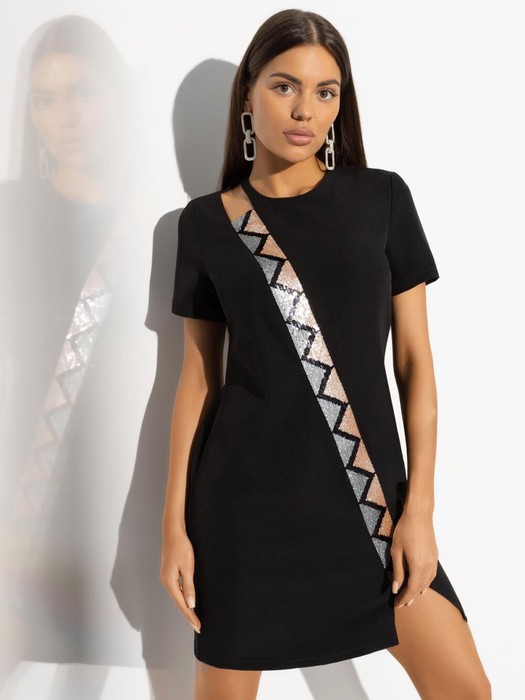 Модная сенсация! Создано самое привлекательное платье. Пока компания CHARUTTI формирует новостную рассылку с обзором на этот шедевр, торопись оформить покупку. Потом может быть поздно. Платье приталенного силуэта в длине мини. Акцентная вставка из паеток вшита. Есть деликатный вырез в районе плеч. Изделие застегивается на скрытую молнию по задней части изделия.