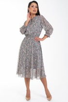 Платье женское прямого силуэта, зауженное к низу, отрезное по талии, с округлым вырезом горловины и втачными рукавами. Полочка оформлена застроченым складками и пришивным украшением. Баска и рукава выполнены из красивого гипюра в цвет основной ткани.