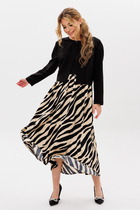 Платье женское относится к нарядной торжественной одежде. Платье полуприлегающего силуэта, с отлетной накидкой длиной за колено. Перед с двумя нагрудными вытачками, с двумя талиевыми вытачками. Спинка с двумя талиевыми вытачками и средним швом, заканчивающимся шлицей. Застежка на потайную тесьму-молнию в среднем шве спинки. Горловина круглая, обтачная, без воротника, по горловине закреплена накидка. Слева на уровне линии талии отделочным хлястиком, декорированным тесьмой накидка закрепляется на платье, нижняя часть накидки закреплена в левом боковом шве. Накидка с фигурным низом. Платье без рукавов. Длина спинки 103 см. Длина накидки от горловины 38 см