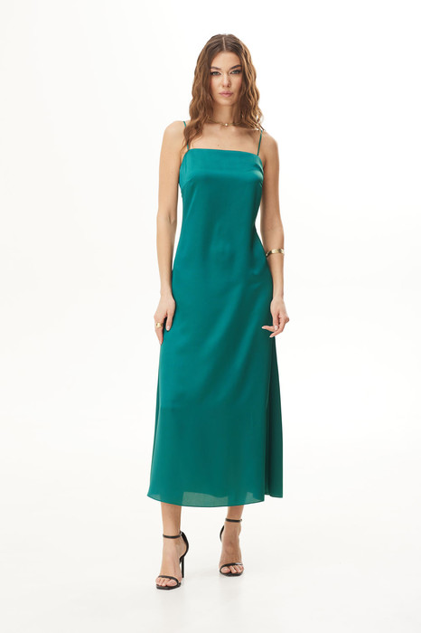 Платье-сорочка на бретелях из струящейся ткани. Длина миди. Застёжка на потайную молнию в боковом шве.