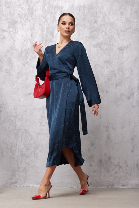 Платье  на запах с асимметричной линией низа. Длина миди.  Платье отрезное по талии. Вырез горловины V-образный. Рукав прямой с манжетой понизу.  По талии платье фиксируется широким завязывающимся поясом. Платье  на подкладке.