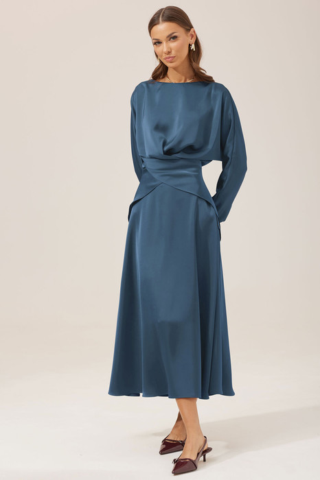 Юбка полуприлегающего силуэта расширенная книзу из струящейся ткани. По верху юбки притачной пояс. В 50-54р на спинке в пояс вставлена эластичная тесьма(резинка). В левом боковом шве потайная молния.