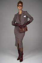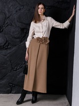 Юбка прямая, зауженная к низу, на притачном поясе, застежка на тесьму-молнию в среднем шве, который переходит в шлицу. На подкладке.