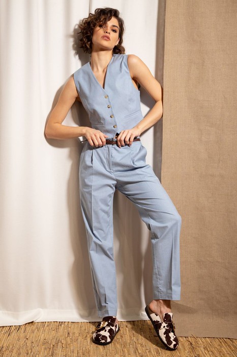 Жилет из натуральной ткани полуприлегающего силуэта С V-образным вырезом и центральной застежкой на пуговицы. Перед с отрезными бочками и имитацией карманов с листочками. Спинка со средним швом, отрезными бочками и хлястиком по центральной части спинки. Низ фигурный. Жилет на хлопковой подкладке.