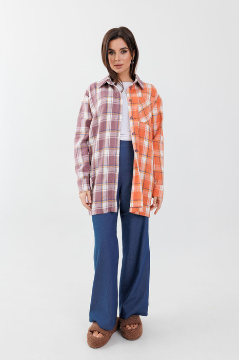 Рубашка женская оверсайз, удлинённая. Спущенная линия плеча, рукав длинный, низ обработан фигурным манжетом. Горловина обработана рубашечным воротником на стойке. По переду застежка на петли пуговицы, на левой половинке переда нагрудный карман. Рубашка двух цветов, из клетки, будет отличным дополнением вашего образа и при этом в ней вам будет тепло и уютно.