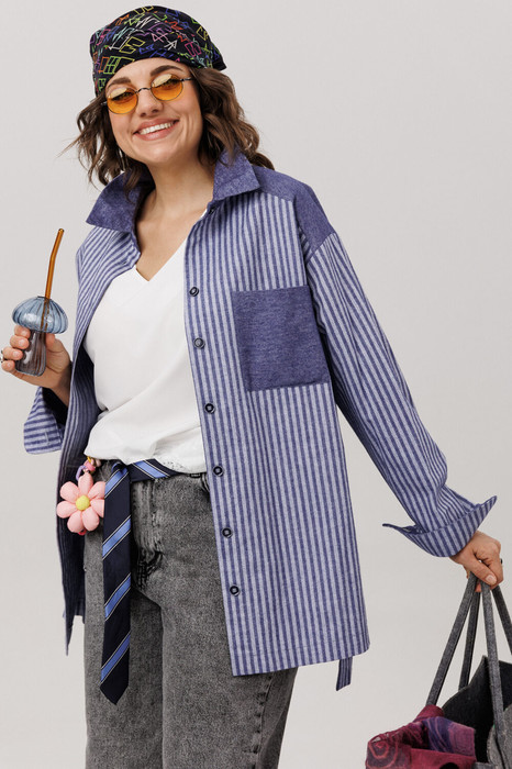 Строгий отложной воротник на стойке и функциональная застёжка на пуговицы по всей длине придают вещи аккуратную чёткость. Детали - кокетка, карман, воротник и манжеты, выполненные из контрастной однотонной ткани, - создают тонкую игру текстур. Асимметричный низ мягко завершает силуэт, предлагая современное прочтение классической формы.