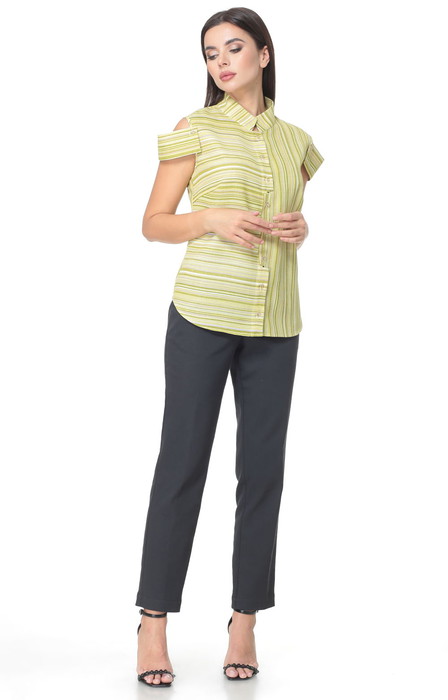 Оригинальная блуза полуприлегающего силуэта. Перед блузки с центральной оригинальной застежкой. Горловина блузки обработана воротником-стойкой. Рукав-крылышко с дизайнерским решением, оно отстегивается. Длина блузы по спинке 63 см