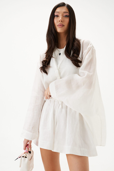 Рубашка свободного кроя выполнена из натурального полотна. Характеристики: рубашка прямого свободного кроя, горловина стойка. Застежка центральная на петли пуговицы, рукав акцентный объёмный, крой рукава летучая мышь, спинка отрезная с декоративной сборкой. Длина по спинке 80 см, длина рукава от горловины 76 см.