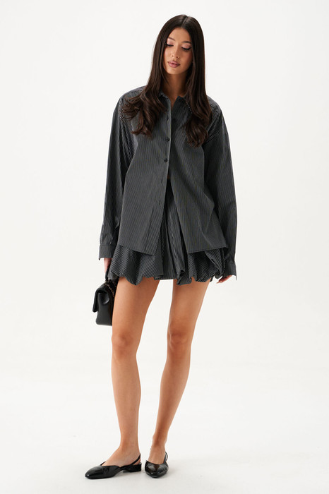 Рубашка прямого кроя выполнена из текстильного черного полотна с принтом вертикальной полоски.Характеристики: прямой крой, отложной воротник, застежка центральная - петли пуговички, рукав слегка спущен по низу рукава манжета на пуговичках, спинка отрезная, низ в изделии с плавным срезом, в боковых швах разрезы. Длина спинке 73 см, длина рукава 77 см от края горловины.