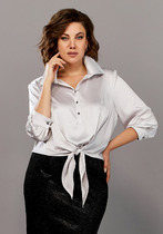 Блузка приталенного силуэта. Выполнена из мягкой струящейся ткани. Воротник жакетного типа , отложной с лацканами.Рукав втачной, с манжетой. Манжета с разрезом, застегивается по передней части рукава.В боковых швах на уровне талии пояс-завязка.Низ прямой с разрезами по боковым швам. Застежка центральная пуговицы. Длина рукава 60 см. Длина спинки 80 см