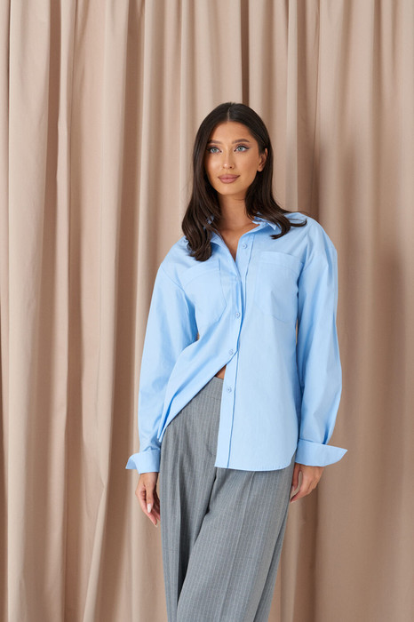 Блузка прямого кроя выполнена из хлопкового полотна голубого цвета. Характеристики: прямой крой, отложной воротник, застежка центральная на петли пуговицы, функциональные карманы по передней части изделия, втачной рукав, по низу рукава манжета на пуговицах, спинка отрезная с двумя рельефами, идущими из-под кокетки до низа, низ изделия с плавным срезом. Длина по спинке от края горловины 71 см, длина рукава от края горловины 80 см.