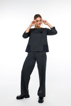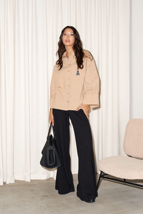 Рубашка прямого свободного кроя выполнена из полотна песочного цвета. Характеристики: прямой свободный крой, отложной воротник на стойке, застежка центральная на петли пуговицы, по переду карман с апликацией в виде буквы "А", рукав спущен, по рукаву декоративные складки, по низу рукава широкая манжета, спинка цельнокройная, по бокам изделия разрезы 10см. Длина по спинке 61 см, длина рукава от края горловины 68 см.