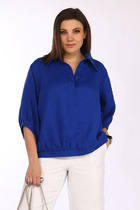 Блузка женская свободного покроя со спущенной и углублённой проймой и втачным рукавом с манжетой по низу рукава. По переду накладные карманы по линии груди, воротник рубашечный на стойке, застёжка спереди на петли и пуговицы.Низ изделия фигурный.