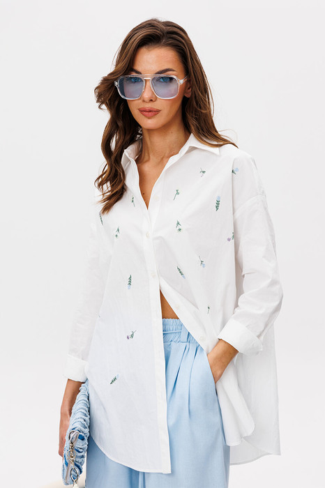 Блузка прямого силуэта, с втачным одношовным рукавом, внизу со складкой и манжетой, с застежкой на петлю-пуговицу. Полочка с застежкой по притачной планке на петли-пуговицы. По переду вышивка "Цветочки". По спинке кокетка и встречная складка от кокетки. Воротник рубашечный отложной на стойке. Спинка и полочка с фигурным низом. Внизу по боковым швам обработаны разрезы.