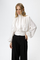 Блузка, комбинированная прямого силуэта, с втачным одношовным рукавом, со складкой и манжетой, с застежкой на петли-пуговицы и спущенной линией плеча. Полочка из трикотажа и рубашечной ткани с центральной застежкой на петли-пуговицы и вышивкой "Самолет". Спинка из трикотажа с печатью "BUTER". Воротник рубашечный отложной на стойке. Спинка и полочка с фигурным низом. Внизу по боковым швам обработаны разрезы.