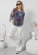 Блузка женская полуприлегающего силуэта из эко-кожи. Застежка центральная на притачных планках с пробивными кнопками. Воротник на стойке. По переду обработан накладной карман с декоративной тесьмой и клапан. В боковых швах – разрезы. Рукава втачные, двухшовные, длинные, по низу рукавов притачные манжеты.