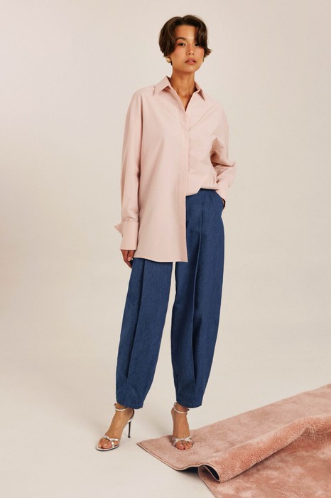 Блузка женская "оверсайз" прямого силуэта. Воротник отложной на стойке. Рукав спущенный с притачной широкой манжетой с отворотом. Разрез рукава обработан планкой. Застежка по переду потайная, на пробивные петли и пришивные пуговицы. Дизайнерская вышивка на воротнике.