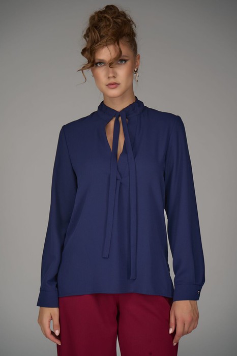 Стильная блузка “Аманда” прямого кроя в насыщенных оттенках. Лёгкая драпировка у воротника и длинные завязки создают элегантный акцент, который позволяет носить модель как с бантом, так и в свободном варианте.