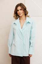 Рубашка свободного силуэта из хлопковой ткани в полоску. Перед с двубортной застежкой и карманом в районе груди. Воротник со стойкой. Спинка с кокеткой и складкой. Рукав втачной рубашечный с высокой манжетой на 2 петли и пуговицы. Длина рубашки - 70 см. Длина рукава - 60 см.