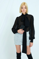 Базовая рубашка. Линия плеча спущена. Рукав длинный на манжете. По переду накладные карманы и застежка на петлю пуговицу. На воротнике пришит декоративный элемент в виде губ. Низ изделия фигурный.