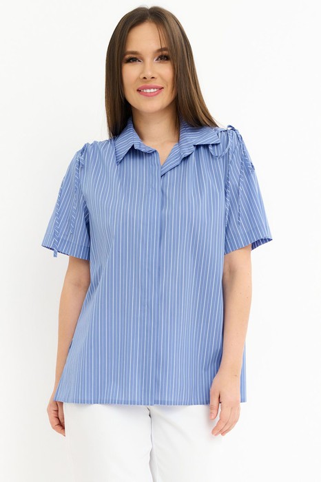 Стильная блуза рубашечного кроя с центральной застежкой на пришивные пуговицы, скрытые планкой из основной ткани. Рукав втачной. По плечу декоративная сборка на шнурок, выполненный из основной ткани. Воротник отложной на стойке. Длина блузы от плечевого шва 73см. Длина рукава 25см.
