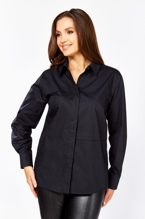 Хлопковая блузка-рубашка прямого силуэта. Рукав длинный рубашечный на манжете, воротник отложной рубашечный. По полочкам и спинке горизонтальные застроченные декоративные складки В боковых швах по низу разрезы