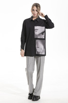 Стильная рубашка свободного кроя с цельнокроеной кокеткой полочки и спинки, со спущенной линией  плеча. Модель прямого силуэта, c рубашечным воротником и длинным рукавом на манжете.  На левой полочке  обработана вставка с поперечным рисунком  из отделочной ткани. Линия низа имеет асимметричную форму, спинка длиннее, чем полочка. Низ изделия  обработан окантовкой .  По спинке заложена и застрочена бантовая складка. По переду блузы планка на пуговицах.