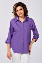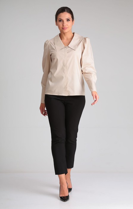 Стильная блузка прямого силуэта из  ткани содержащей хлопок. Изделие с горловиной  V-образной формы и отложным воротником. Передняя часть блузки с потайной застежкой на пуговицы и одной декоративной пуговицей.  Рукав втачной со сборкой по окату и притачной широкой манжетой с застежкой на три пуговицы.  Спинка изделия цельная.