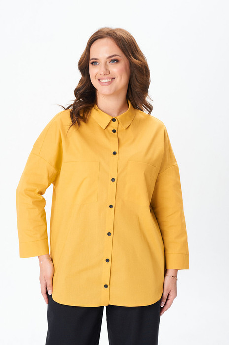 Стильная рубашка свободного кроя с центральной планкой на застежку петли-пуговицы и накладными карманами по переду. Плечо изделия спущено. Рукав 7/8 прямой с широкой манжетой. Воротник со стойкой. Спинка изделия цельная. Низ изделия фигурный отстрочен отделочной строчкой.