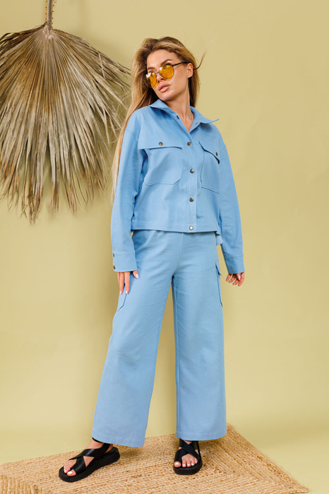 Укороченная рубашка из хлопка прямого кроя со спущенной линией плеча. Горловина обработана рубашечным воротником с отрезной стойкой. Застёжка центральная на кнопки. Есть нагрудные карманы и в боковых швах. Низ рукава обработан притачной манжетой, застёгивается на кнопки.  Изделие без подкладки.